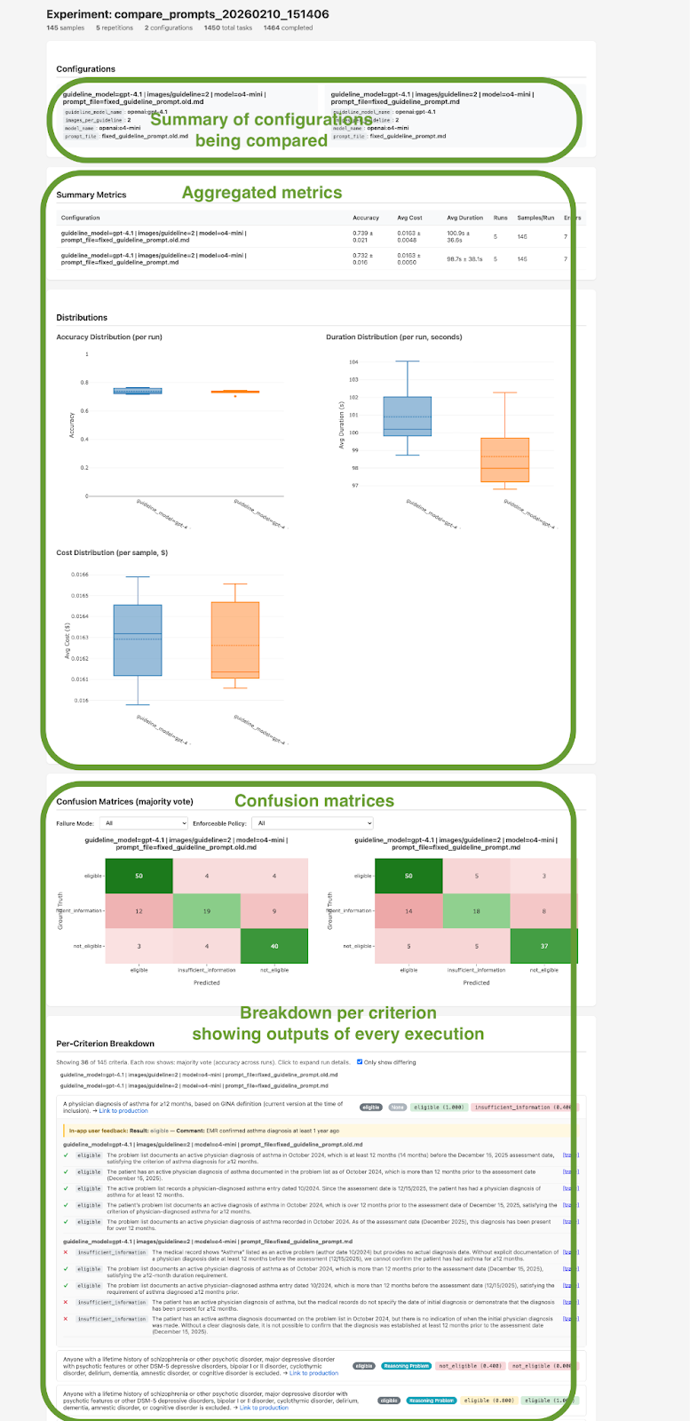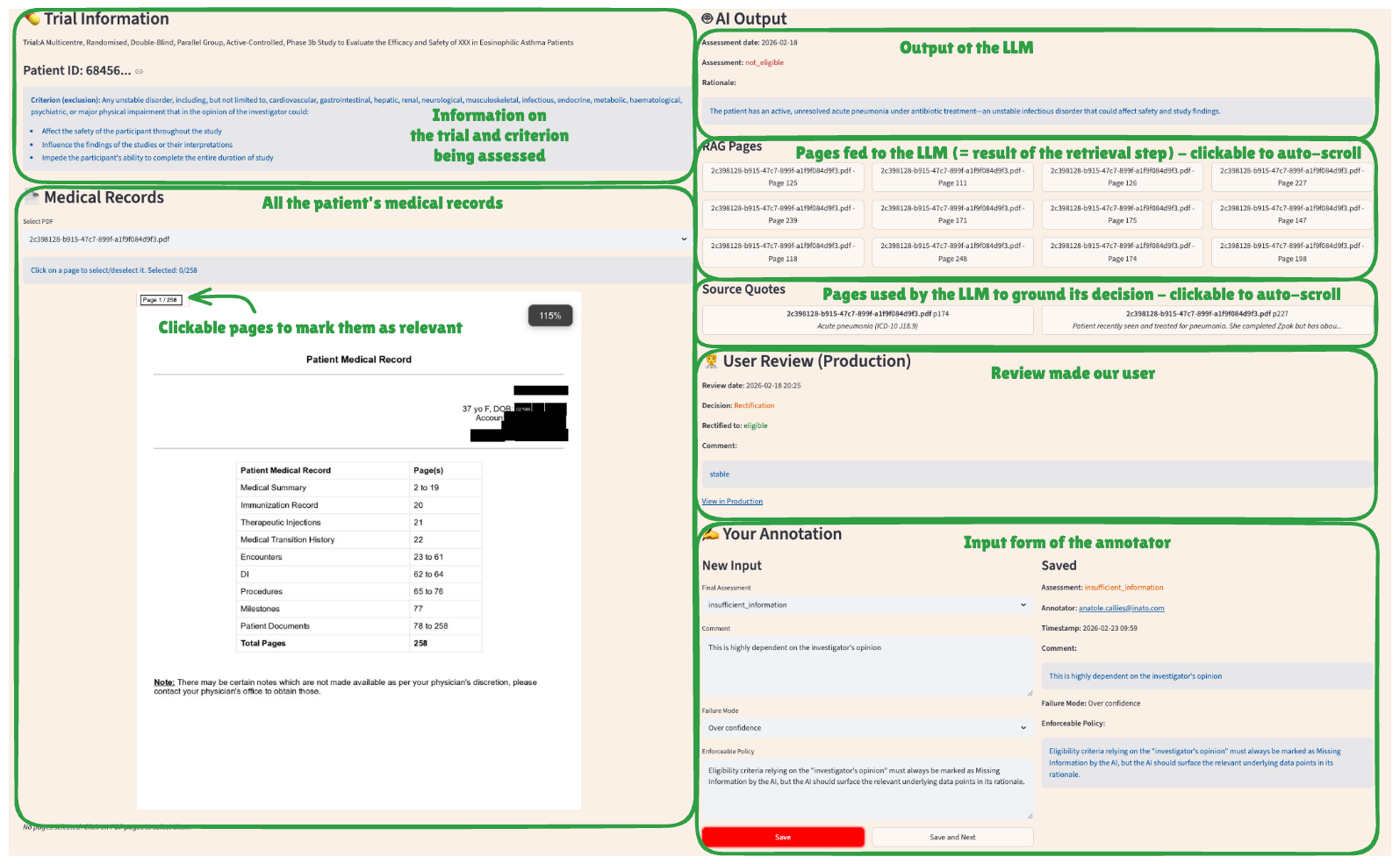 Before diving into the custom tooling we built, let’s set the stage with the actual problem our AI is solving. Our product aims at interpreting raw medical records extracted from Electronic Health Records to evaluate whether a patient is eligible to a clinical trial. Specifically, eligibility criteria are assessed one by one: a multimodal embedding model first extracts the relevant pages of the patient files (ranging from typed notes to handwritten tables and graphs), and a frontier Vision-Language Model interprets them to output an eligibility assessment for that criterion (Eligible, Not Eligible, or Missing Information) alongside a rationale and linked source pages. An eligibility report is shown in our product for every patient and our users (typically Clinical Research Coordinators) can manually confirm or rectify our AI’s assessment before deciding whether the patient is worth being further screened in person. The end goal is to accelerate the identification of eligible patients. We described and demonstrated the impact of this system in detail in Callies et al., 2025, Communications Medicine.
